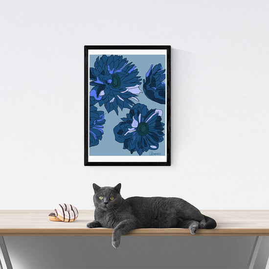 Affiche de 30x40 cm illustrant des anémones, dans les tons de bleu