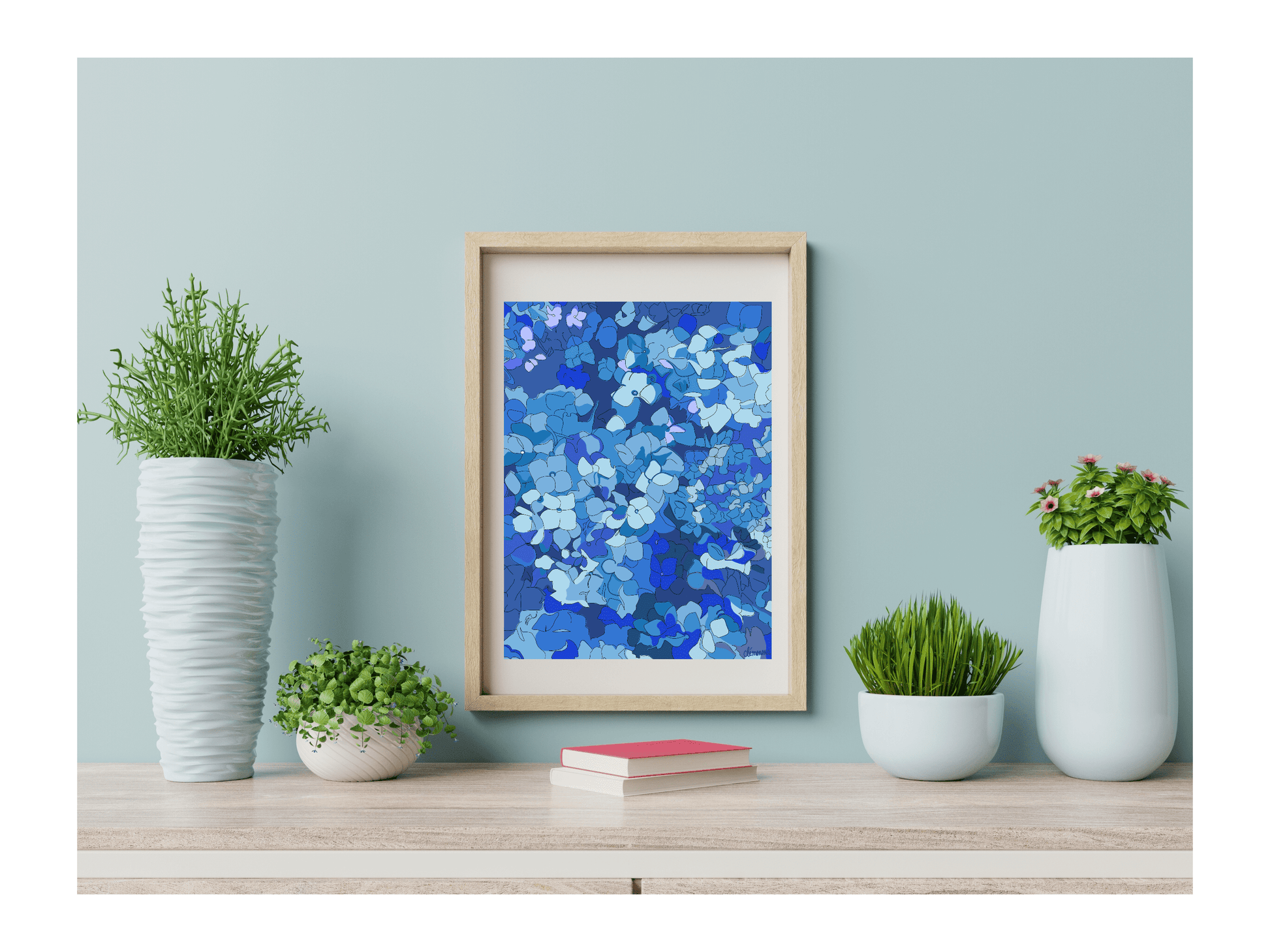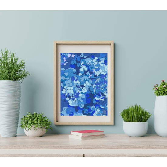 Affiche de 30x40 cm illustrant des hortensias, dans les tons de bleu