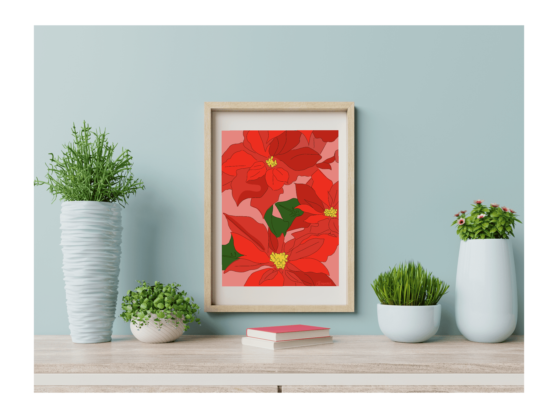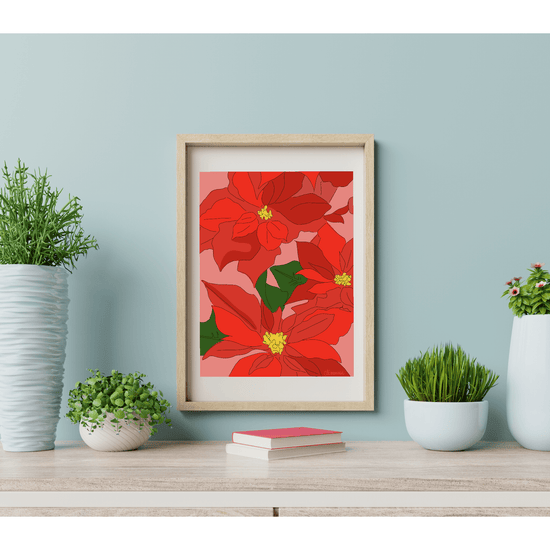 Affiche de 30x40 cm illustrant des poinsettias, dans les tons de rouge