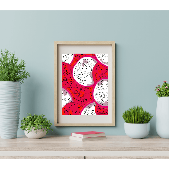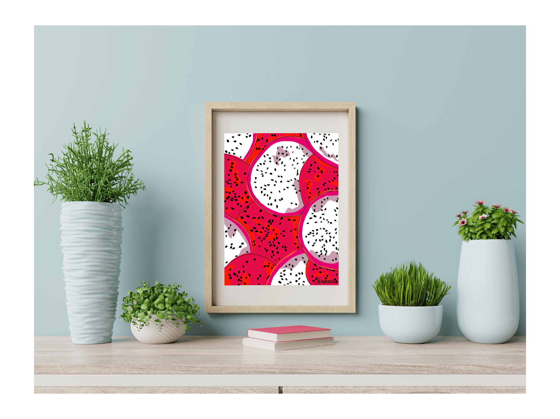 Affiche de 30x40 cm illustrant des fruits du dragon, dans les tons de rose et blanc