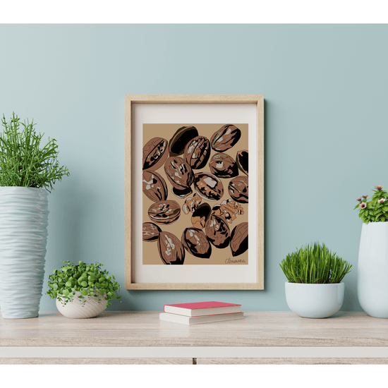 Affiche de 30x40 cm illustrant des noix, dans les tons de beige et de marron