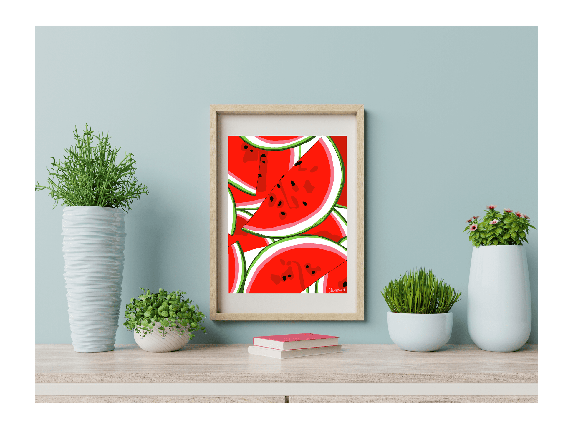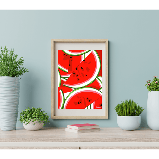 Affiche de 30x40 cm illustrant des pasthèques, dans les tons de rouge
