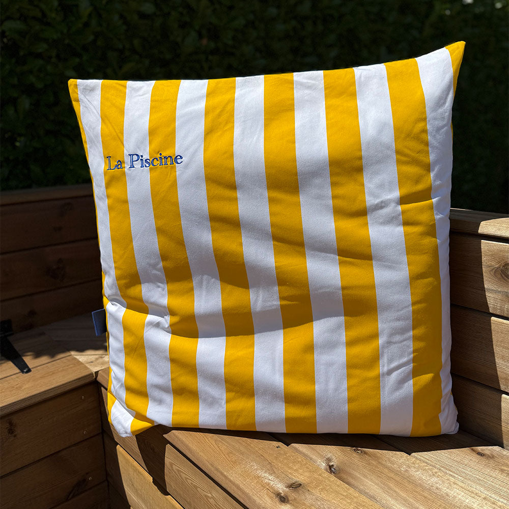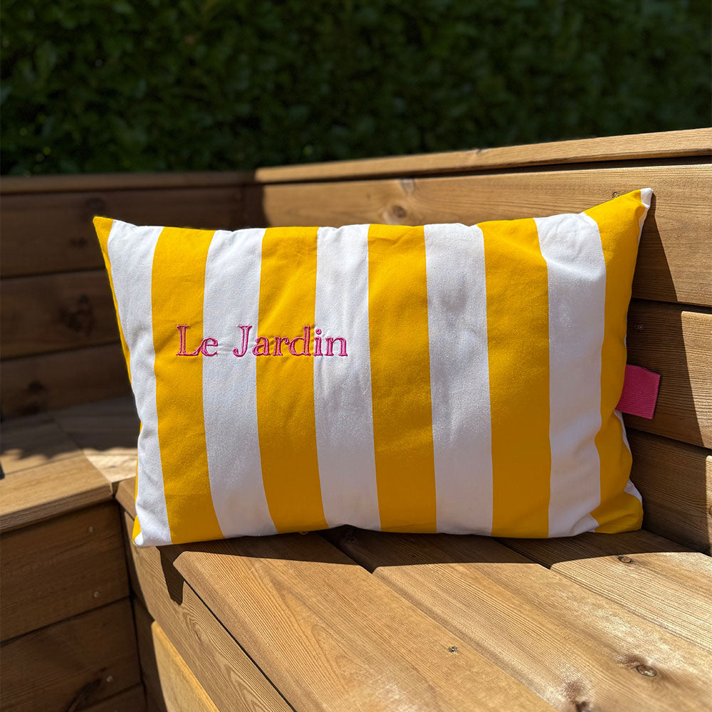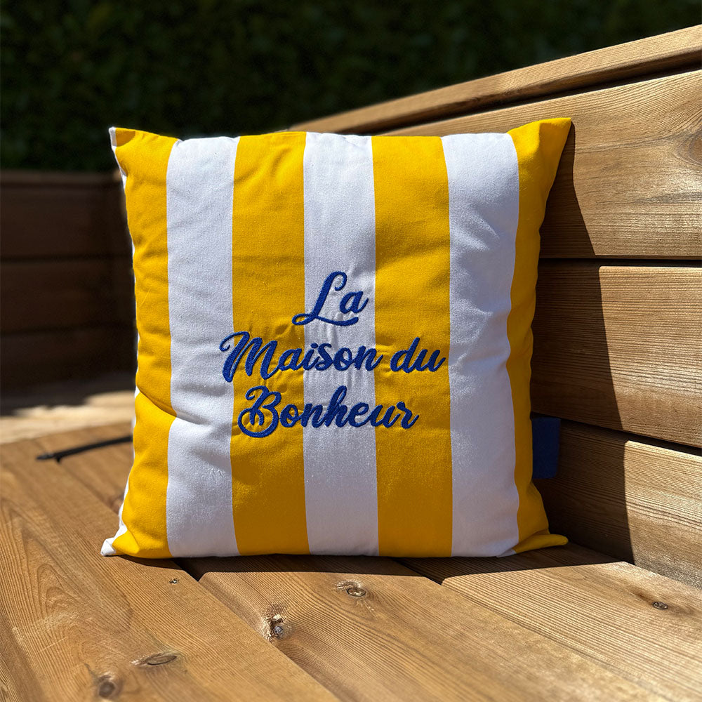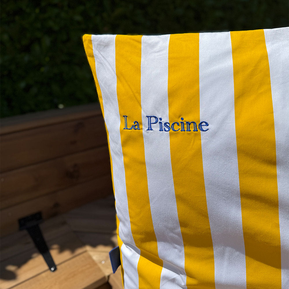 Le coussin d'intérieur idéal pour votre canapé ou votre bord de piscine. Broderie en rose ou bleu