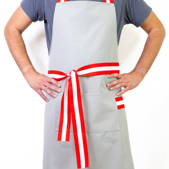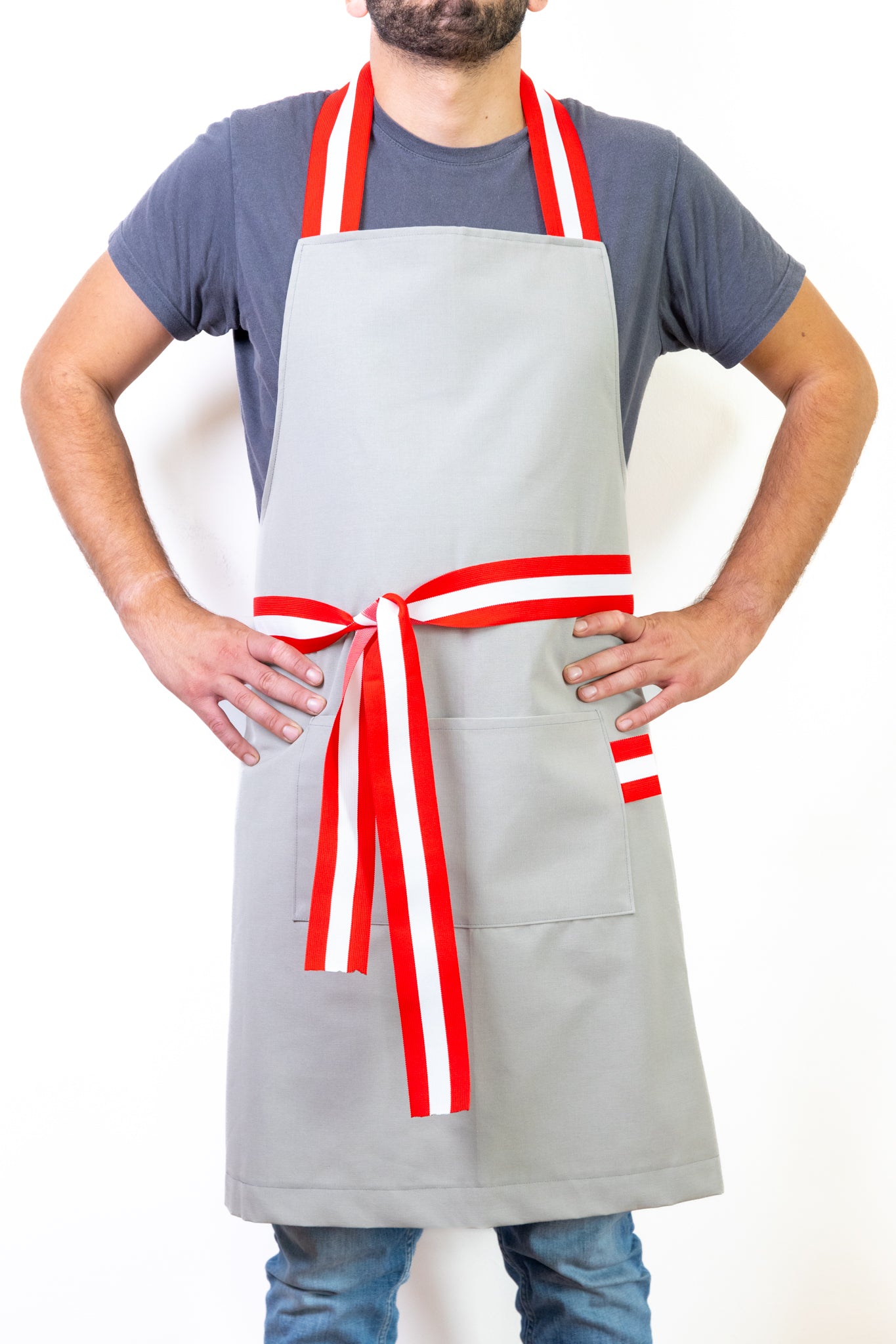 Tablier cuisine beige moka en 50% Coton et 50% polyester avec galon blanc et rouge en nylon.