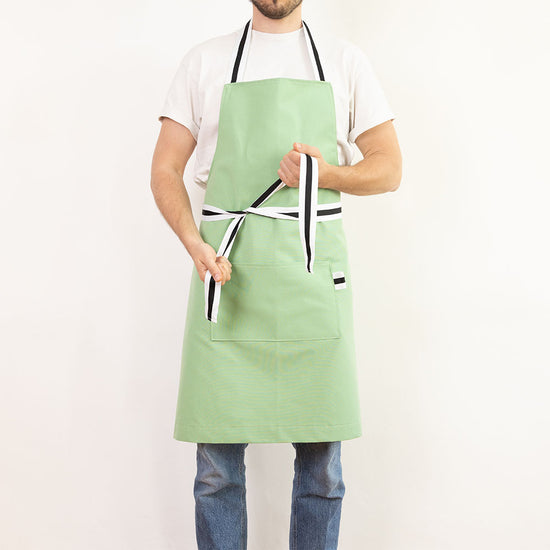 Tablier crée avec amour en Chartreuse dans les tons de blanc, . Le tablier parfait pour réaliser de bons petits plats dans votre cuisine. Avec sa toile 50% Coton et 50% polyester, et son galon blanc et noir en polyester, il est d'une longueur de 88cm.
