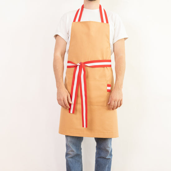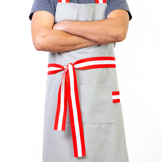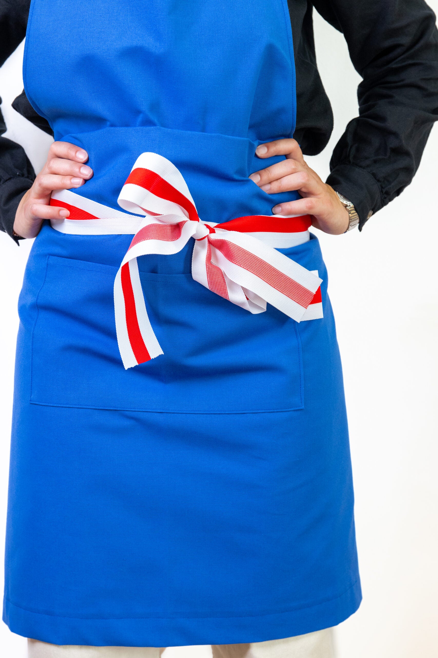 photos @jimprunier Tablier cuisine bleu france en 50% Coton et 50% polyester avec galon blanc et rouge en nylon.