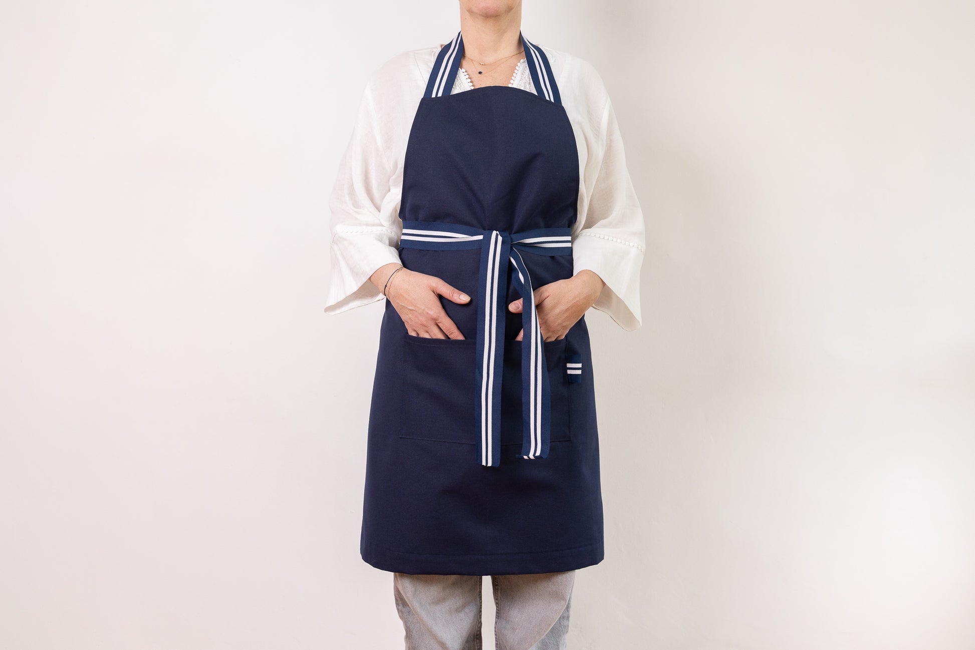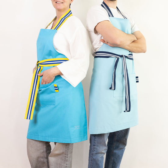 photos @jimprunier Tablier cuisine bleu myosotis en 50% Coton et 50% polyester avec galon blanc et bleu marine en nylon.