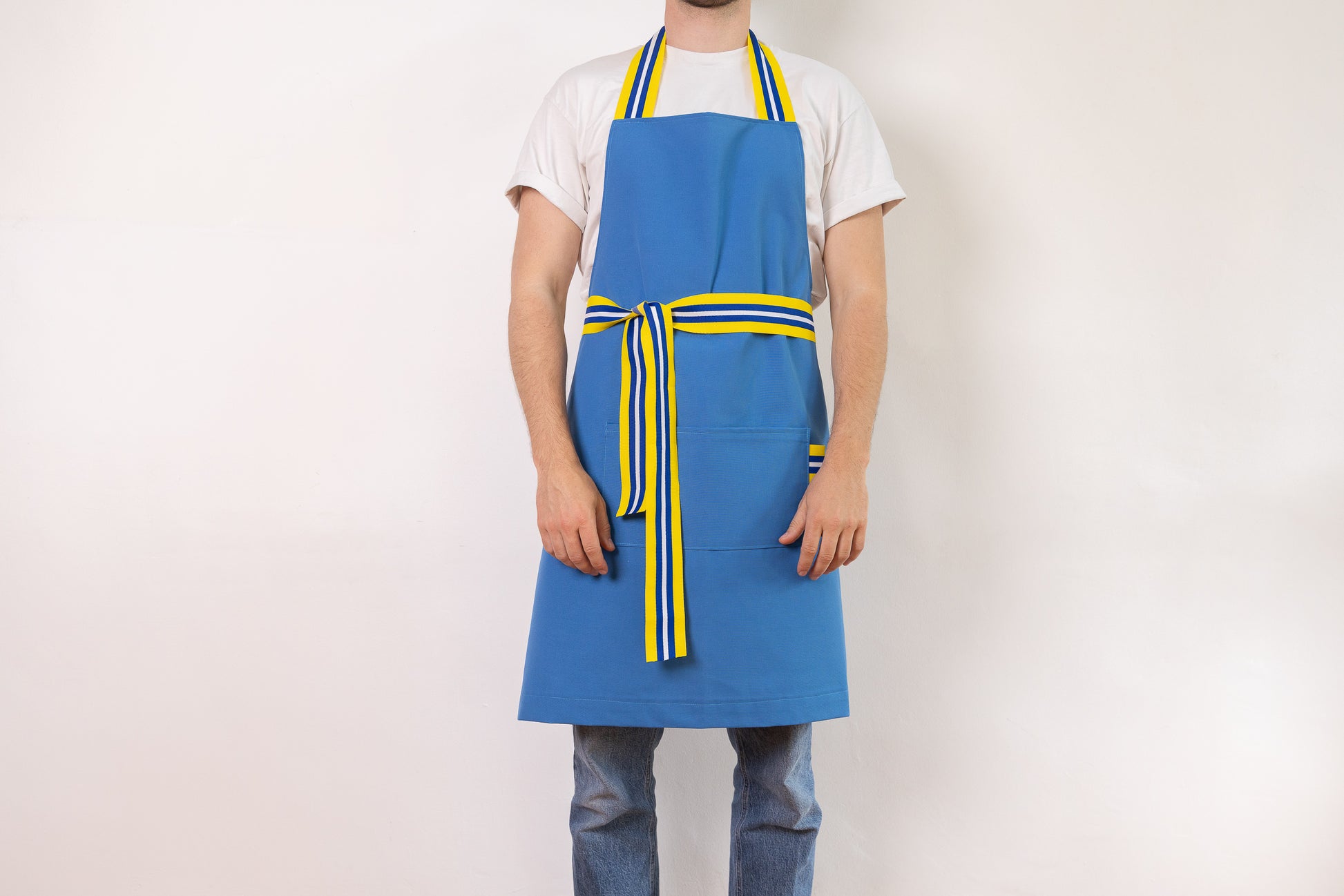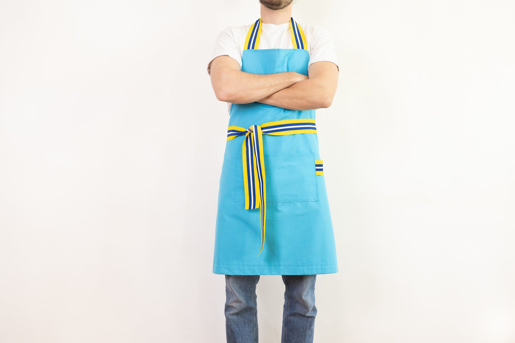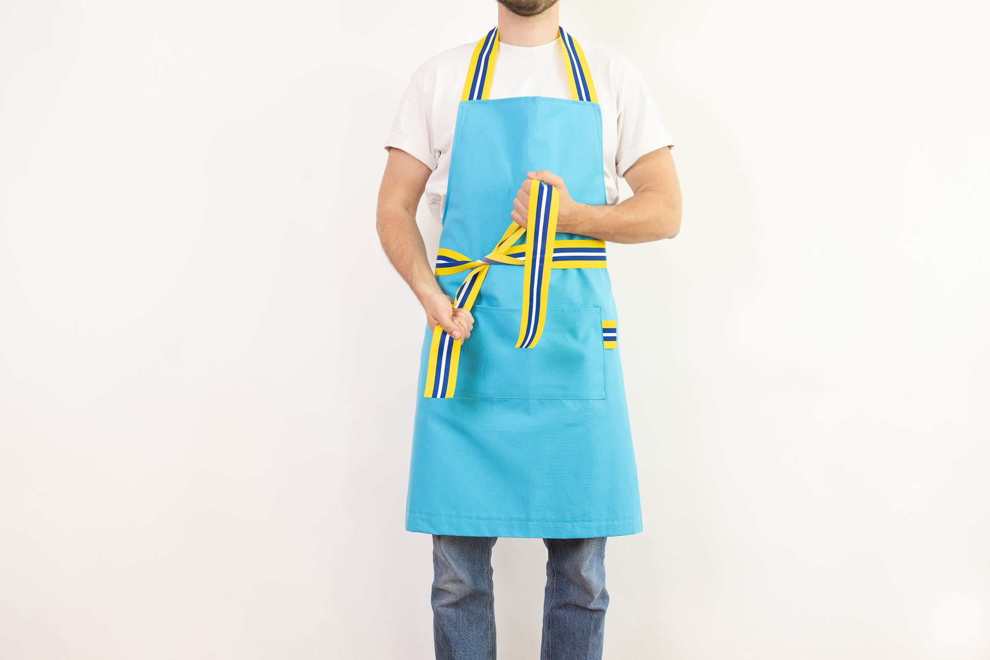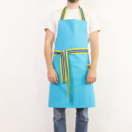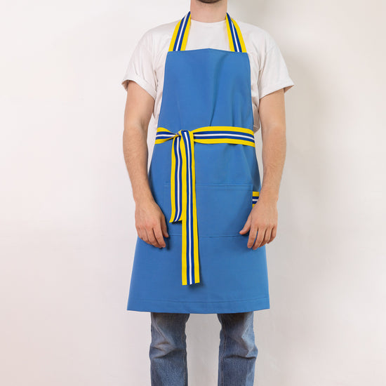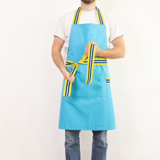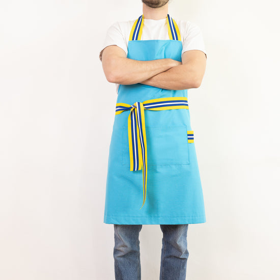 photos @jimprunier Tablier cuisine bleu turquoise en 50% Coton et 50% polyester avec galon jaune, blanc et bleu en nylon.