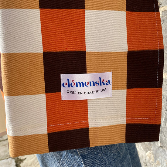 Tablier cuisine à carreaux vintage orange et marron sur fond blanc en 100% Coton avec galon blanc écru en mélange coton polyester.