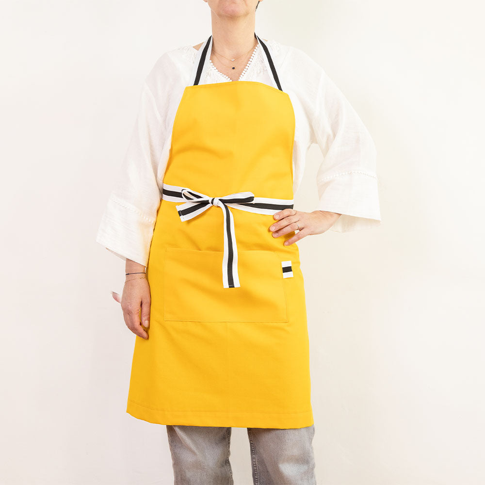 photos @jimprunier Tablier cuisine jaune agrumes en 50% Coton et 50% polyester avec galon blanc et noir en polyester.