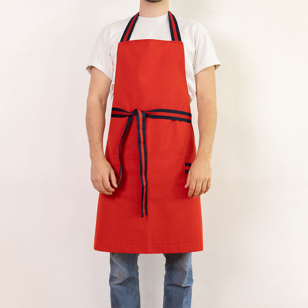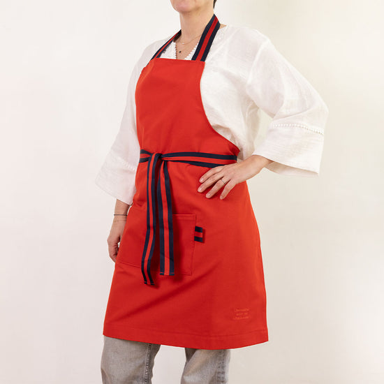 photos @jimprunier Tablier cuisine rouge amour en 50% Coton et 50% polyester avec galon bleu marine et rouge en polyester.