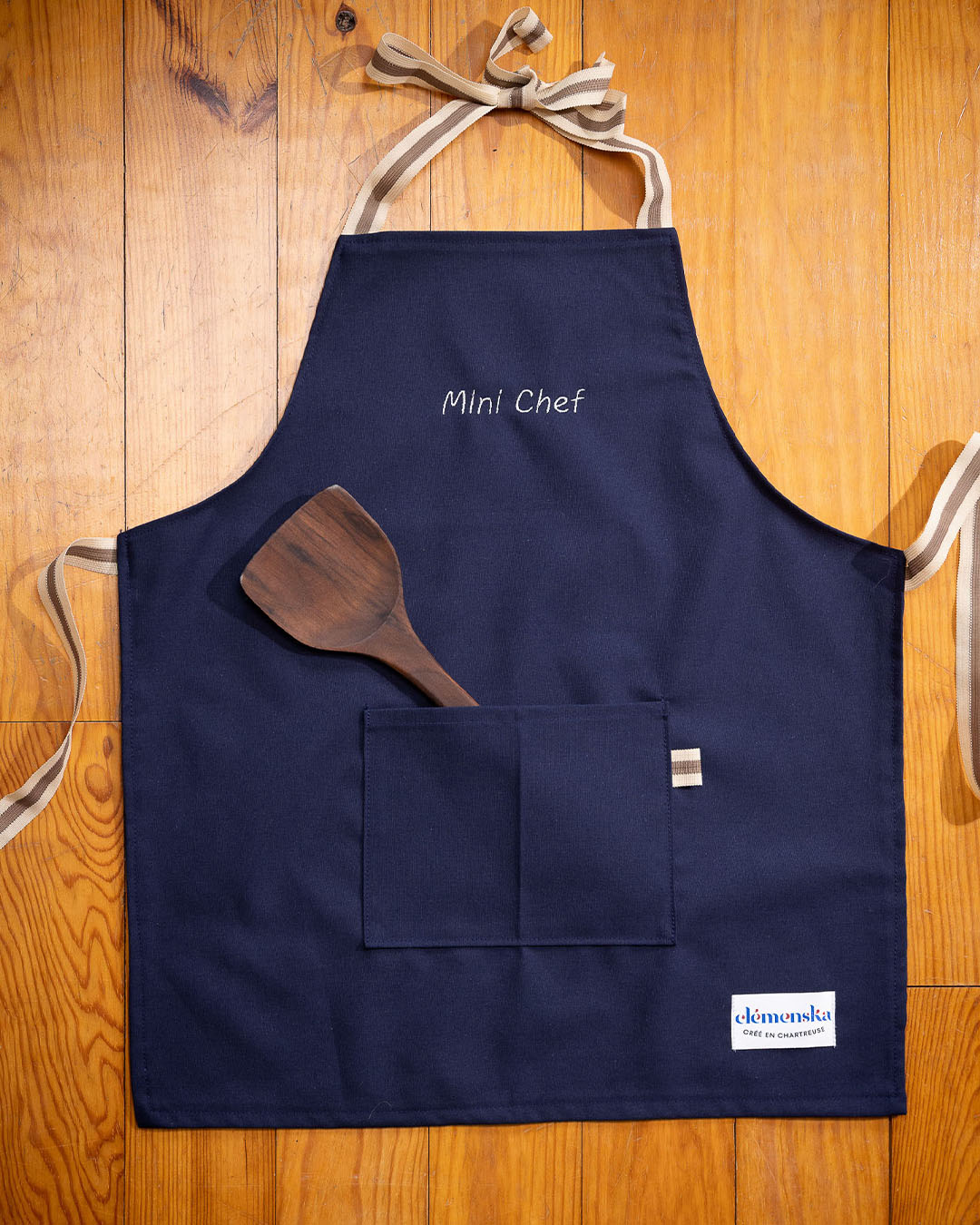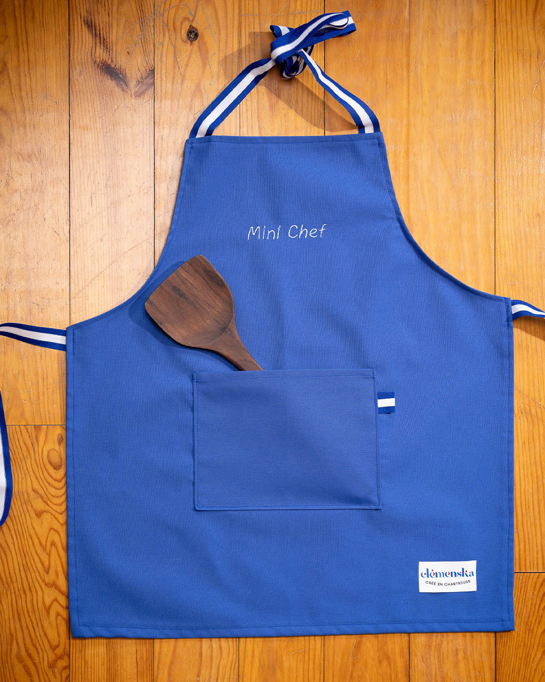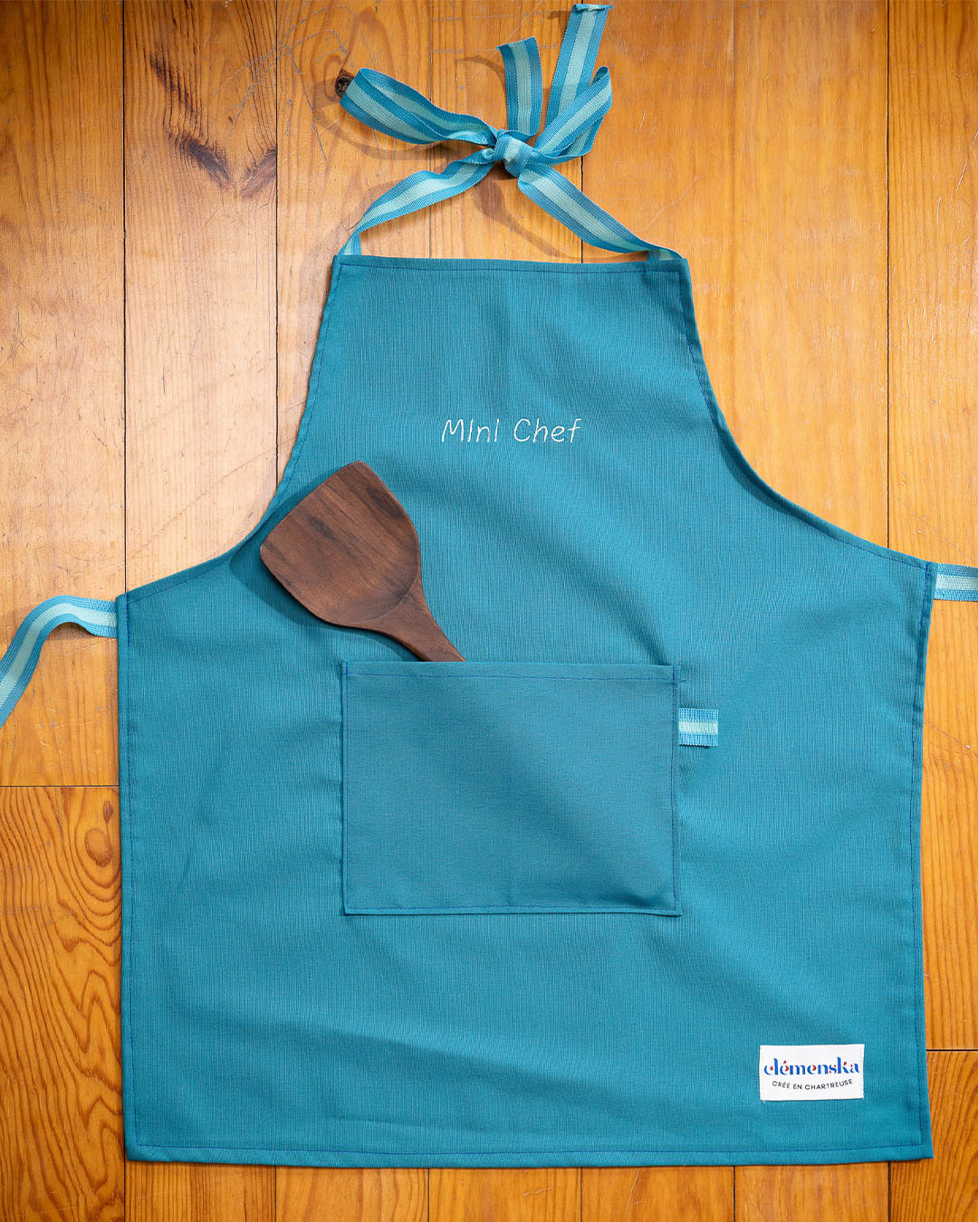 Tablier crée avec amour en Chartreuse dans les tons de bleu marine et beige, . Le tablier parfait pour les enfants qui veulent aider les parents à réaliser de bons petits plats dans la cuisine. Avec sa toile 50% Coton et 50% polyester, et ses galons en nylon, il est d'une longueur d'environ 58cm.