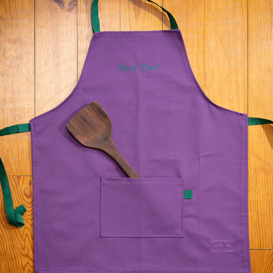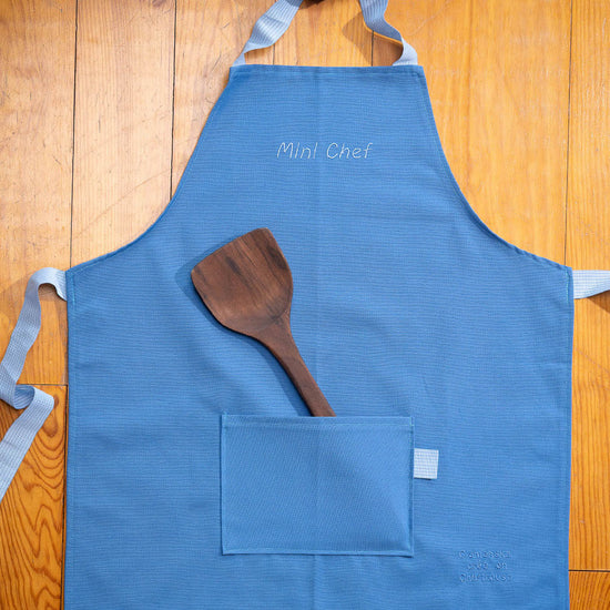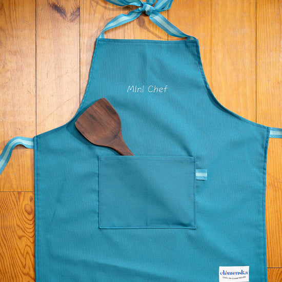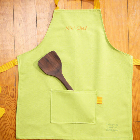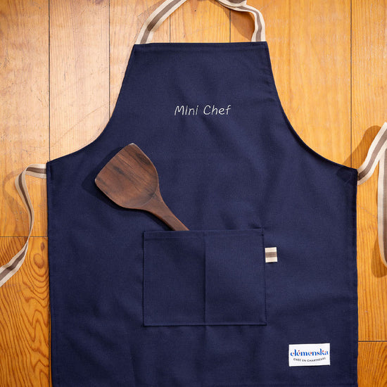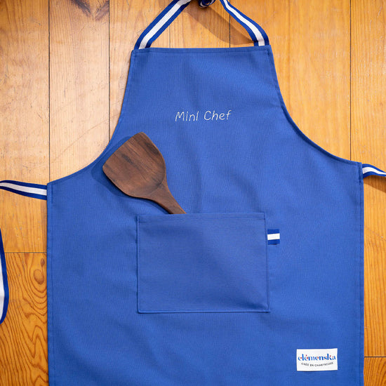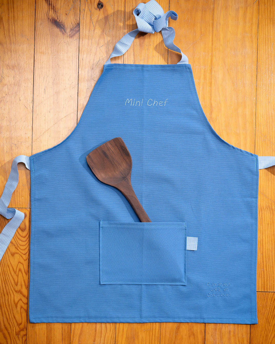 Tablier crée avec amour en Chartreuse dans les tons de bleu marine et beige, . Le tablier parfait pour les enfants qui veulent aider les parents à réaliser de bons petits plats dans la cuisine. Avec sa toile 50% Coton et 50% polyester, et ses galons en nylon, il est d'une longueur d'environ 58cm.