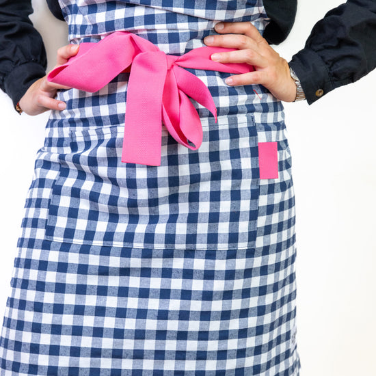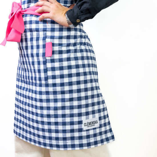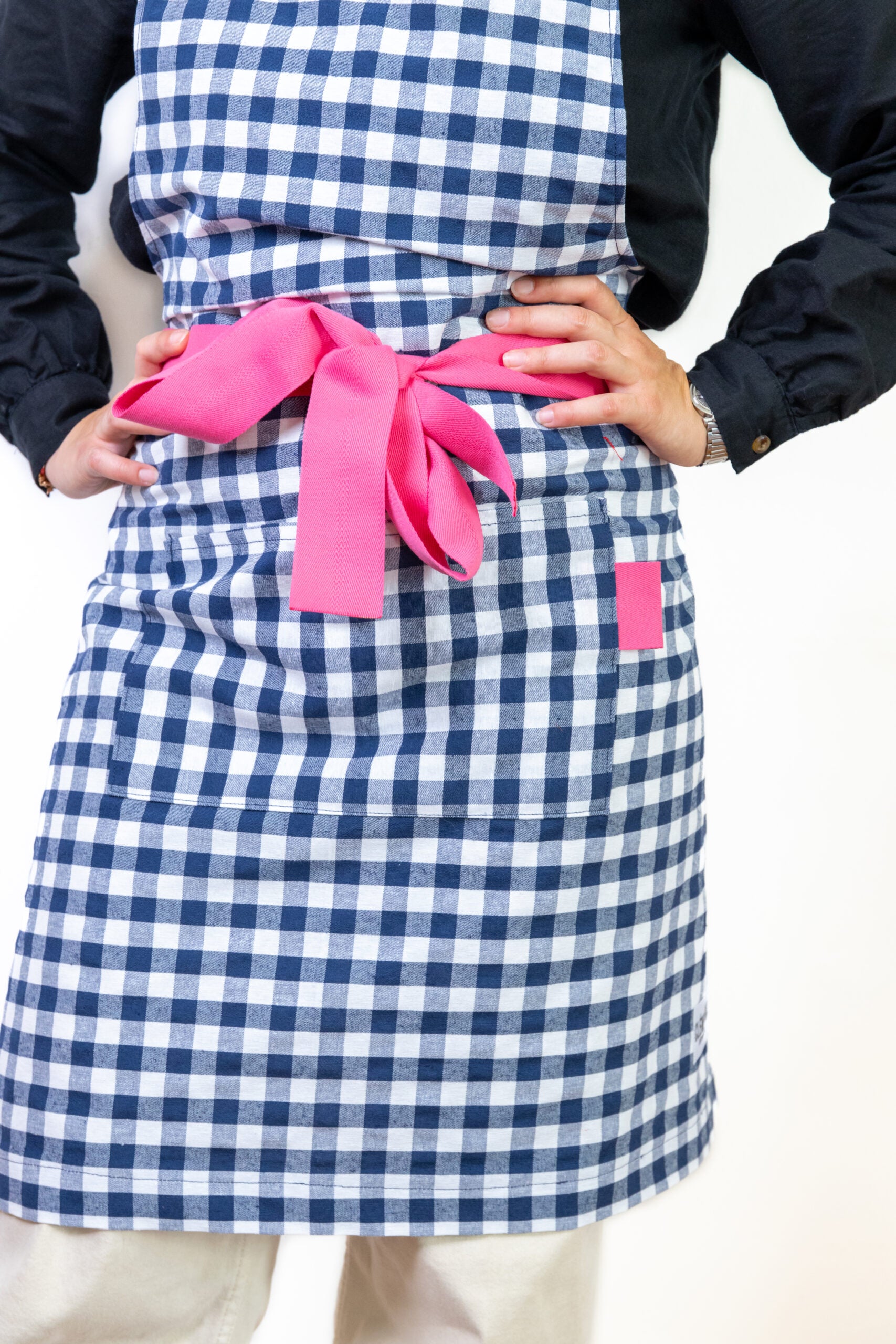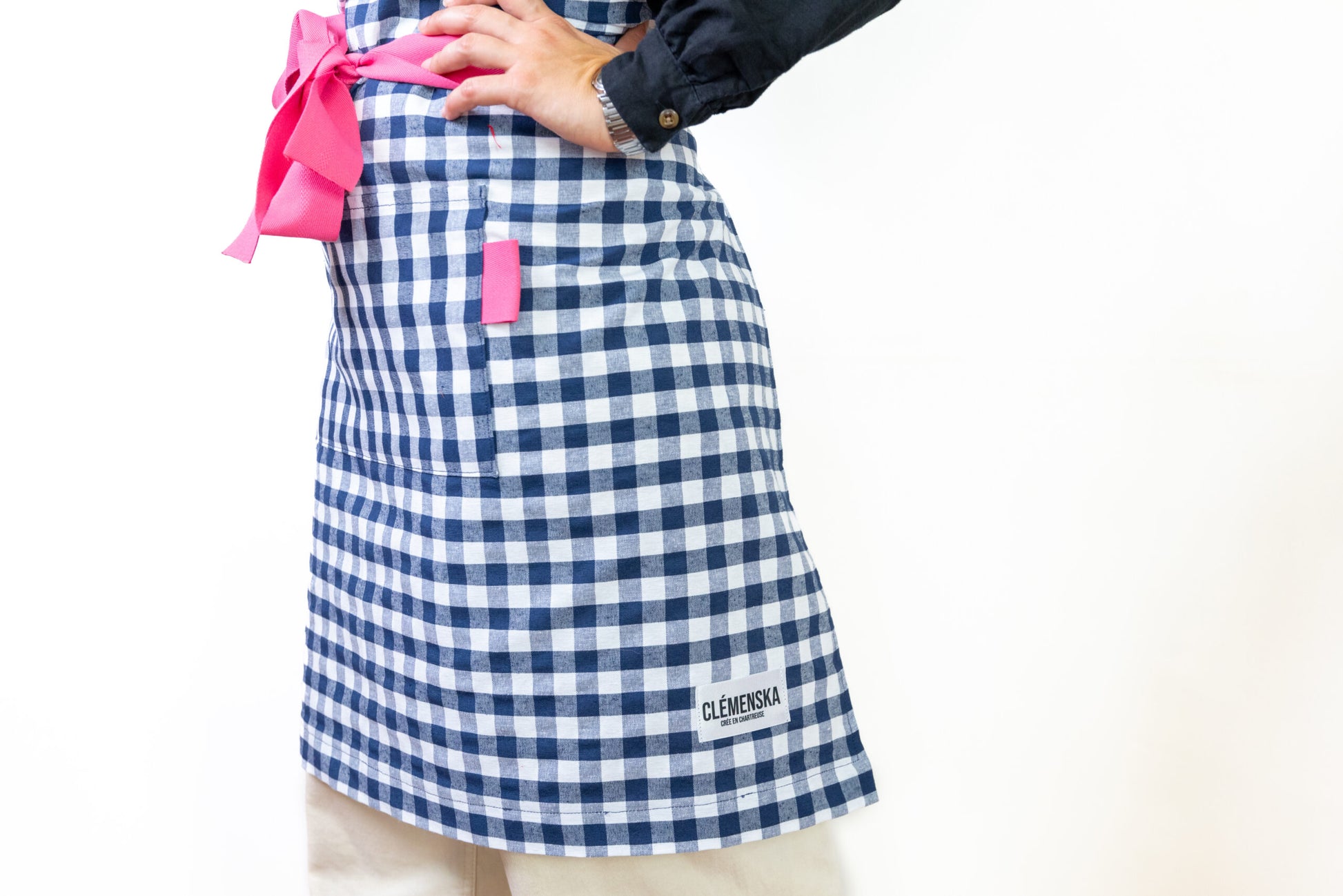 photos @jimprunier Tablier cuisine vichy bleu sur fond blanc en 100% Coton avec galon rose en mélange coton polyester.