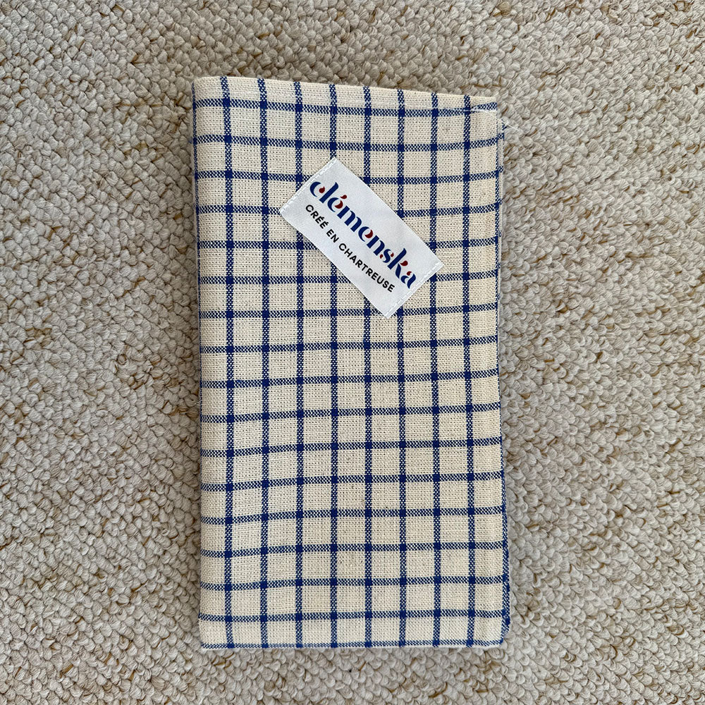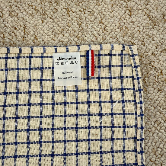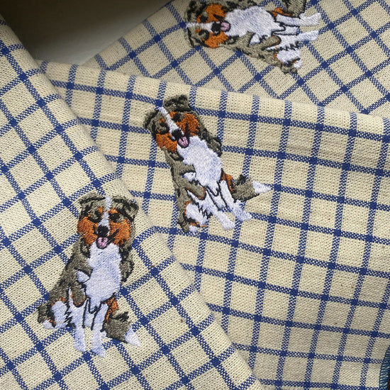 Torchon pour votre cuisine. Toile 100% coton de 49 x 52 cm, motif beige et bleu, finition ourlet. Broderie d'un chien en bas à droite.